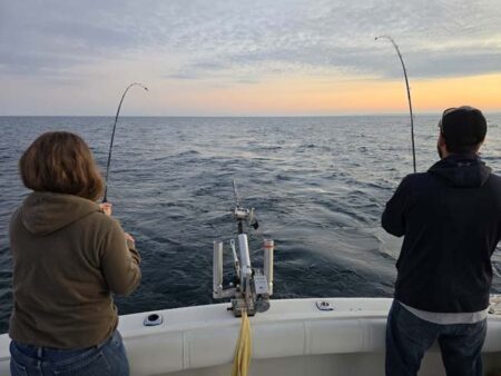 A 225 copper with a Mini Pink Dot DW Plug was the first rod to go this morning. Starboard 250 copper went 2 times with a Mini Natural Glow DW Plug. Port 300 copper with an 8″ Black Slick Spin Doctor/Red Pepper Meat Rig went 1 time. Port 375 copper went 2 times with a Gold Fireball. Port high wire diver out 250 with a 8″ White Slick Flip Fin Paddle/Pickled Sunshine Action Fly went 3 times. Port low wire diver out 150 went 1 time with an 8″ Chrome Green Dot Spin Doctor/Pickled Sunshine Meat Rig. Starboard high wire diver out 225 took a King on an 8″ Green Jeans Paddle/Pickled Sunshine Action Fly. Starboard low wire out 170 went 1 time with a