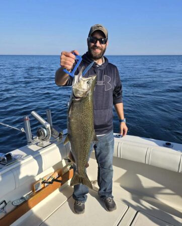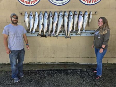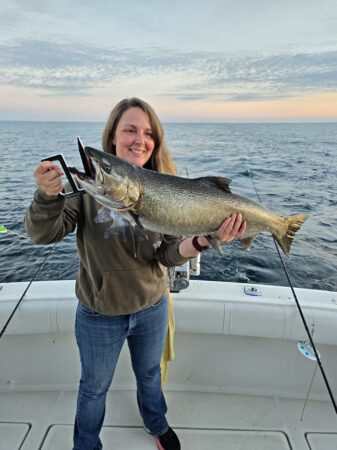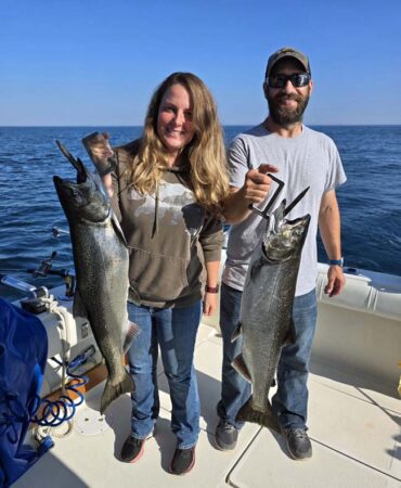 Starboard out down set at 80 went 1 time with a Mini Lucky Charms DW Plug stacked with a SS Soda. The King took the stack. Chute rigger down 90 went twice with an 11″ White Slick DW Paddle/Pickled Sunshine Action Fly stacked with a SS Hulk 15 feet above the Paddle. It went 1 time down 125. A Steelhead took the stack. It was a fun action-packed trip. We use Dreamweaver Deeper Divers, Dreamweaver Ninja Boards, Dreamweaver Premium Strips in all our meat rigs, and Morgan’s Tackle copper and wire.