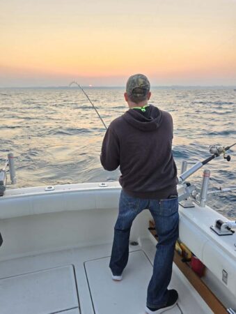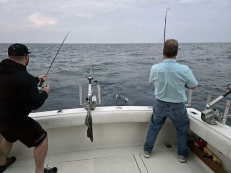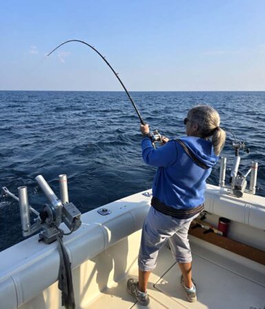 copper went once with a standard size UV Shelly Snack. Starboard 275 copper took a big King on a Mini Pink Dot Captain’s Choice Cut Plug. We lost a big fish on a 325 copper with a Natural Glow Captain’s Choice Cut Plug. Port 300 copper went twice with a prototype White Charlie Special Flip Fin Paddle/Pickled Sunshine Action Fly. Port 350 went twice with an 8″