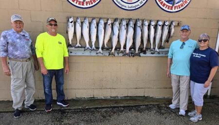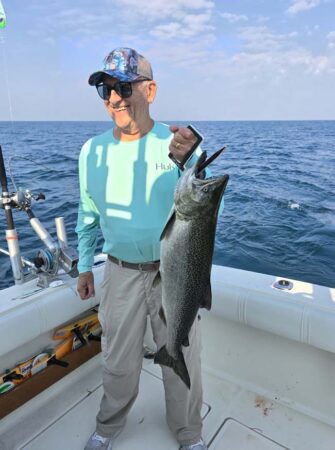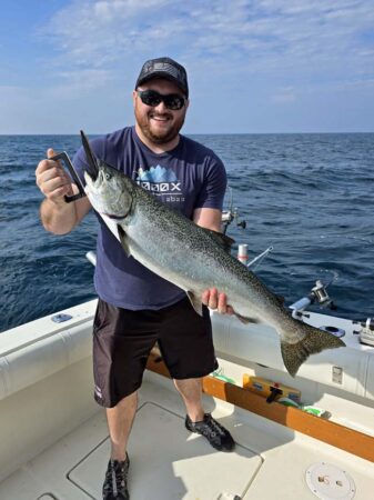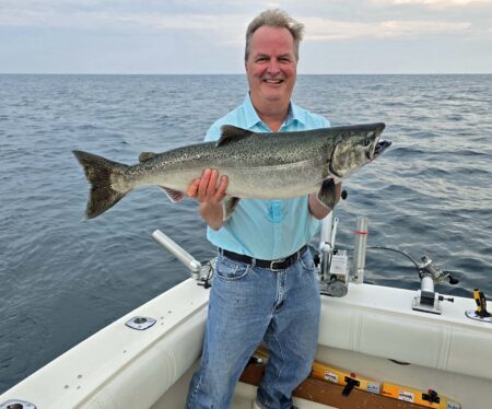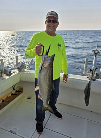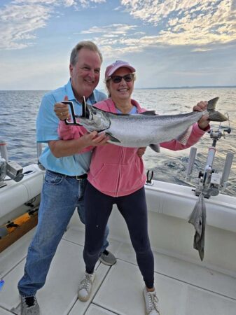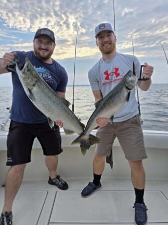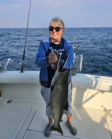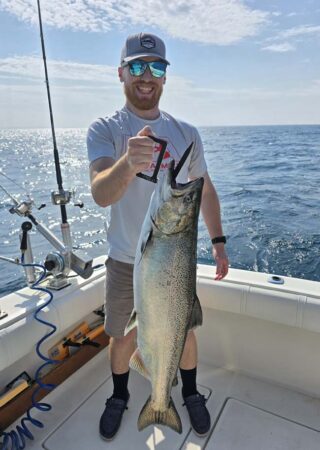 Got a couple bites in the dark this morning. Starboard high wire diver out 185 went with a 10 White Crush Green Scale Spin Doctor/Pickled Sunshine Dreamweaver Meat Rig. Port high wire diver out 200 with an 8″ White Paddle/Glow Fly went. We boated both Kings. The starboard high wire went again later in the morning with the same set up. The port high wire went two more times. Starboard low wire diver out 150 went once with an 8″ Green Scale Black Chrome Paddle/Pickled Sunshine Action Fly. Starboard 275