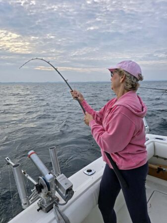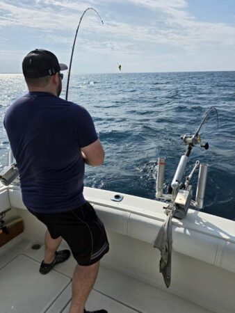 Action Fly. Starboard High wire diver out 265 went twice with an 8″ Green Stud Flip Fin Paddle/Illusion Fly. Port low wire diver out 130 went 5 times with a 10″ White Crush Green Scale Spin Doctor/Pickled Sunshine Dreamweaver Meat Rig. Port out down set at 65 went once with a pair of Bad Toad Spoons and once down 150 with an 8″ White Paddle/Glow Fly. Starboard out down went once down 95 and once down 110 with an 8″ Prototype White Charlie Special Flip Fin Paddle/Pickled Sunshine Action Fly. We had an 11″ White Slick DW Paddle/Pickled Sunshine Action Fly on the chute rigger. It went multiple times down 110, 125 & 150. It was our most productive rod.