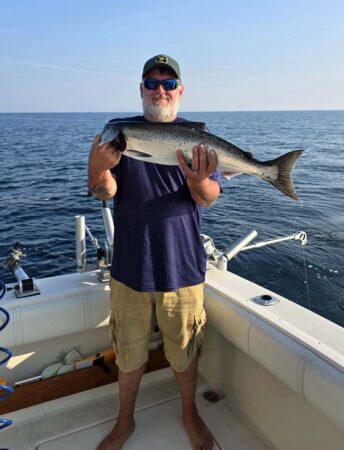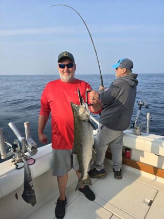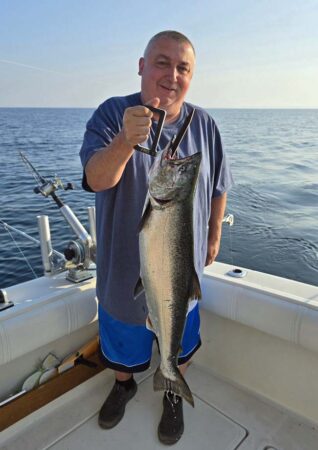 All rods were set when a Coho took a 10 color core with a White Lightning Plug. It went again a little later in the morning. Starboard low wire diver out 80 went twice with a 10″ White Atomic Killer/Green Moo DW Meat Rig. Those were our only 2 meat bites. Starboard high wire diver went once later out 200 with an 8″ Green Closer Flip Fin Paddle. Port high wire diver went 3 times with a White Crush Paddle/Glow Fly out 150. Starboard 3