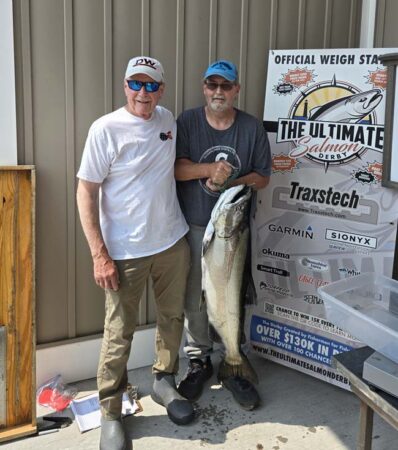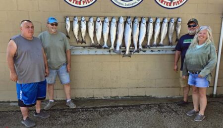 color with a UV Shelly Snack went once so did the port 3 color with a Sunshine spoon. Starboard 7.5 went once with a Sunshine spoon. Port 7.5 went once with a UV Bad Toad. Starboard 10 color went once with a Natural Glow Captain’s Choice Cut Plug. Port 10 color went twice with the same plug. Starboard out down set a 40 went once with a SS A-Bomb. Port out down set at 50 went once with an 8″ White Paddle/Glow Fly and once with an SS Chilly Willy. Chute rigger down 60 went twice with an 8″ White Crush Paddle/Pickled Sunshine Action Fly stacked with a SS Chilly Willy. Both fish took the stack. It went later down 80 and this time a King took the Paddle.