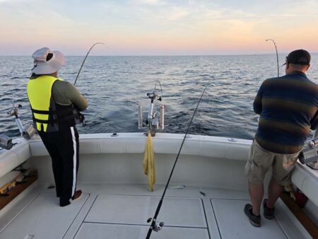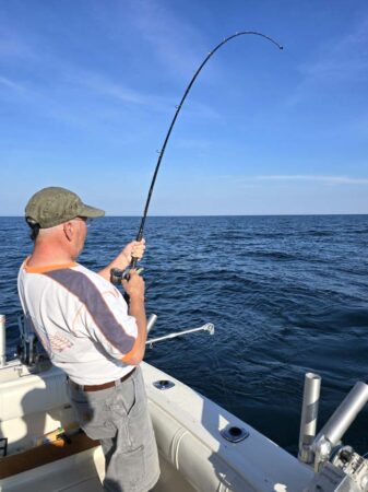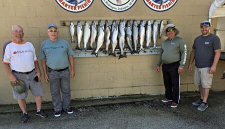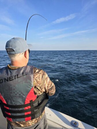 First rod to go this morning was our starboard 225 copper with a Mini Lucky Charms DW Plug. Starboard 250 copper went 1 time with a Mini Natural Glow DW Plug. Starboard 300 Copper went 1 time with an 8″ Chrome White Crush Two Face Paddle/Pickled Sunshine Action Fly. Port 10 color went 1 time with a UV Shelly Snack. Port 250 took a King on a Mini Lucky Charms DW Plug. Port 325 copper went 1 time with an 8″ Chrome Glow Paddle/Glow Fly.