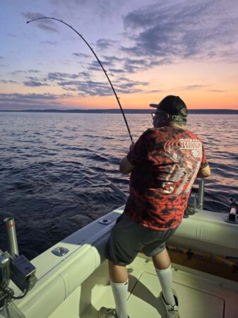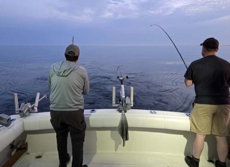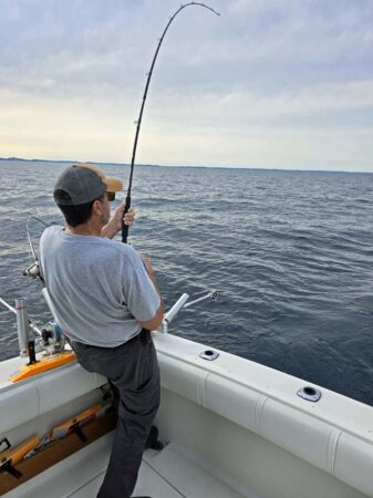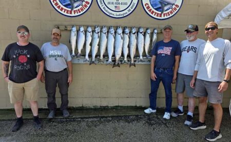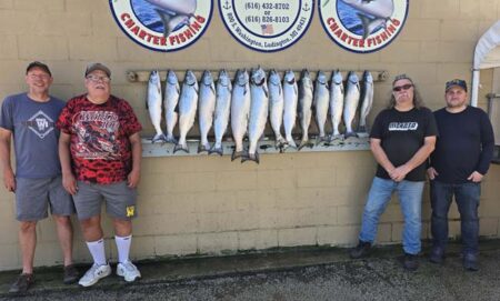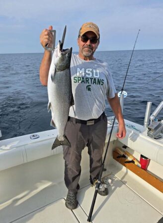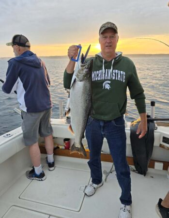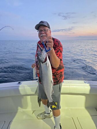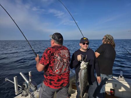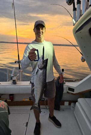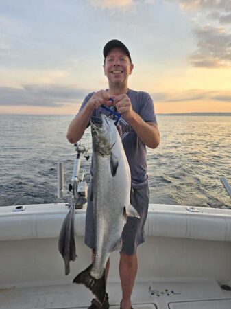 Better bite today. Had trouble keeping them on the hook early but they started to stick a little later in the morning. Lost a fish on a 175 copper with a Bloody Mahi spoon. Boated our first fish, a King, on a 225 copper with a Captain’s Choice Pink Dot Cut Plug. Our port out down set at 60 went several times with a Natural Glow Captain’s Choice Plug and a SS Soda free sliding above it. They would hit and be gone. I think we only boated one fish off it. Starboard out down set at 65 took a King on a Live Wire Flip Fin Paddle/Pickled Sunshine Action Fly.