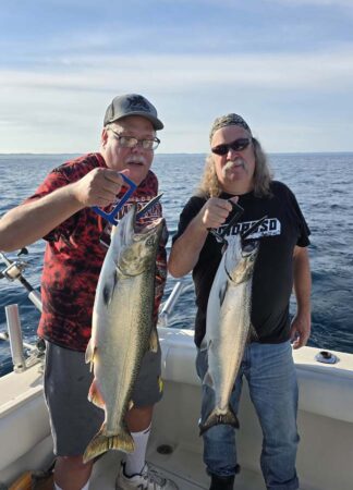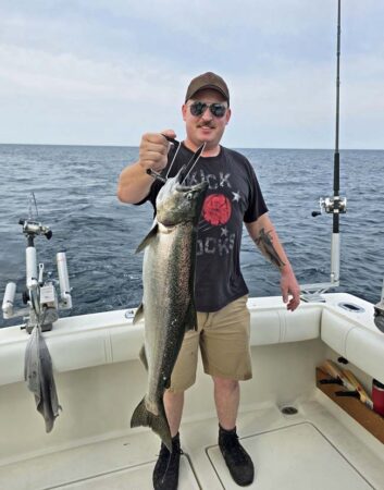 All our rods were set when our starboard 175 copper went with a Bloody Mahi spoon. We landed a King and lost a fish on it. Port out down set at 60 went next with a Captains Choice Natural Glow Cut Plug with a SS Soda free sliding above it. It went 3 more times, twice they hit the plug and once on the free slider. We lost a fish on the chute rigger down 80 with a Mag Fuzzy Bear Shelly Snack stacked with a DW Shelly Snack. Starboard out down set at 70 with a Natural Glow Captain’s Choice Cut Plug and a SS Soda free sliding above took a King. Port high wire diver out 210 took a King on a 10″ White Crush Dark Green Scale Spin Doctor/Pickled Sunshine Dreamweaver Meat