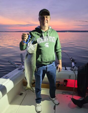 Gold Fireball. Starboard 325 copper went once with an 8″ Black Slick Spin Doctor/Custom Black & Red Meat Rig. It was a fun morning on the Lake with plenty of action. We use Morgan’s Tackle copper and wire, Dreamweaver Deeper Divers, Dreamweaver Ninja Boards, and Dreamweaver Premium Strips in all our meat rigs.