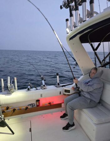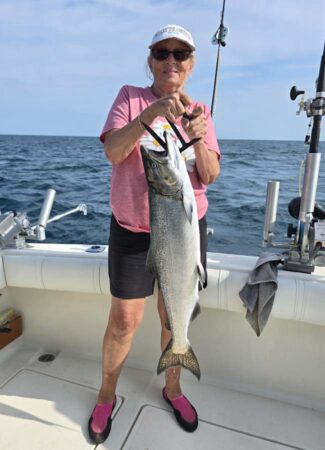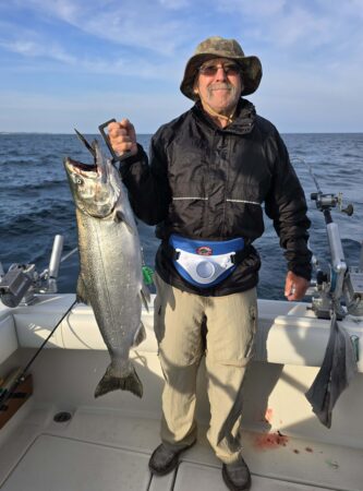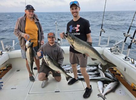 Wind Finder was predicting 3.6 ft. waves this morning, but they were under 3 feet. The Lake was very fishable. The bite was on when we set up. Our 7.5 color cores were hit while they were going out. One had a Mini Natural Glow Captain’s Choice Cut Plug and the other had a Mini Pink Dot Captain’s Choice Cut Plug. We didn’t have time to take many pictures; it was constant action after that. Starboard out down was set at 50 with a Mini Natural Glow Cut Plug and a SS Soda free sliding above it. It went as fast as we could get it down. We quit putting on the slider because all the bites were on the plug. Port out down was set at 55 with a standard Natural Glow Captain’s Choice Cut Plug and a SS Soda free sliding above it. All the bites were on the plug, and it went every time we set it. The chute rigger set at 65 with a mag Fuzzy Bear Yellow Tail and a standard Fuzzy Bear Yellow Tail stacked 10 feet above it went several times. All the bites were on the mag spoon.