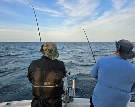 The Mini Captain’s Choice Cut Plugs were hot. They had all been leak tested and had new Dreamweaver hooks on them. The new hooks held up well, no bends or breaks. Our crew must have had an idea how the morning was going to go. They showed up with just a bottle of water each and no food. They didn’t have time to drink the water until we were headed in. It was awesome fishing. We use Morgan’s Tackle copper and wire, Dreamweaver Deeper Divers, Dreamweaver Ninja Boards, and Dreamweaver Premium Strips in all our meat rigs.
