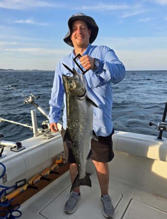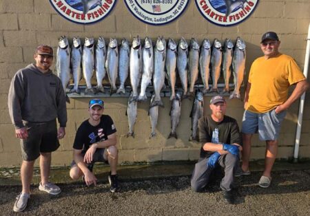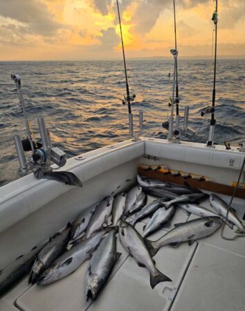 n 8″ White Crush Black Dot Spin Doctor/Pickled Sunshine Action Fly. Port low wire diver out 100 went once with an 8″ Paddle/Custom Fly. The chute rigger down 80 took a King down 80 with a 10″ Glow Blade Spin Doctor/Pickled Sunshine Action Fly. Later we had it down 150 with an 11″ custom White Crush Paddle with Green Dots/Pickled Sunshine Action Fly. Dreamweaver has had a handful of their new Mini Cut Plugs come back with leaks. They are currently hand water testing all of the new plugs. When they pass the leak test they will be repackaged with 2 new stronger hooks. We ran a two boat charter out of Harbor View Marina with Clocked Out Charters. Boat boats had good catches and happy clients. The picture below is our catch. We use Morgan’s tackle copper and wire, Dreamweaver Deeper Divers, Dreamweaver Ninja Boards, and Dreamweaver Premium Strips in all our meat rigs.
