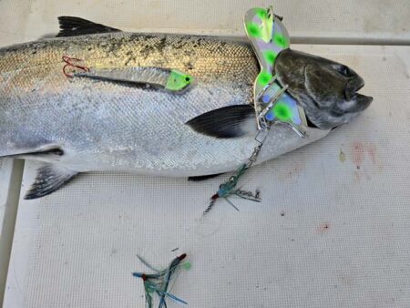 That combo has taken at least one big King for us every trip there is a picture of it below. The meat head looks green in the picture, but it is the standard out of the package uv head. Starboard high wire diver out 160 went once with an 8″ White Crush Black Dot Spin Doctor/Pickled Sunshine Action fly. It went 2 more times out 160 with an 8″ White Crush Two Face Flip Fin Paddle/Pickled Sunshine Action Fly. Later in the trip it went once out 235 with an 8″ Green Stud Flip Fin Paddle/Illusion Fly. Port High Wire Diver out 150 went once with an 8″ Paddle/Custom Fly. Starboard low wire diver out 110 went 2 times with a