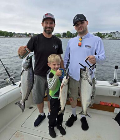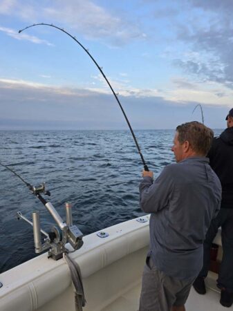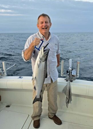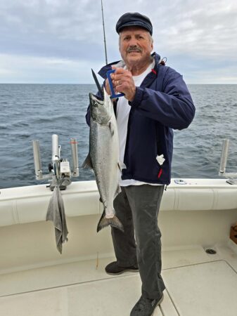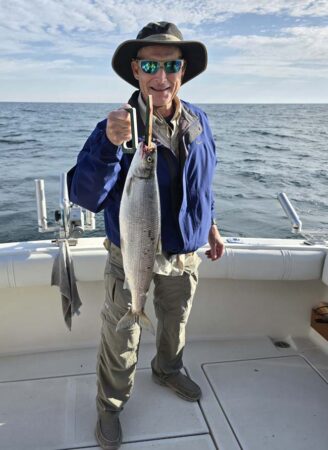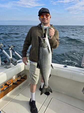 Tough fishing for us today. We got a late start but hit a nice fish when we were setting up. It hit a Gold Yeck Fireball on a 400 copper. First mate Abe’s favorite rig lately. It was on for a while, but gave a strong head shake and was gone. The water was still warm, 56 degrees down 90 on our Fish Hawk. The waves were 2 to 3 footers from the southeast. We missed a fish on an out down set at 85 with a pair of standard green glow spoons. Those were our only bites on a long downwind troll. We weren’t marking the fish we had seen on our last two trips. We turned and made an upwind troll. It was hard to get a good speed going into the waves, but we finally hit another fish. It was on a 350 copper with a Yeck Gold Fireball.