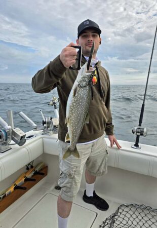 First Mate Abe likes to get a little unconventional. He caught one on a 400 copper with a Gold Yeck Fireball. I was going to change out the mag PK Special spoon on a 450 copper when a fish hit it. It ended up being a 22″ Master Angler Cisco.