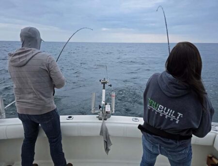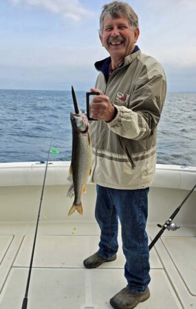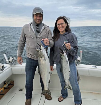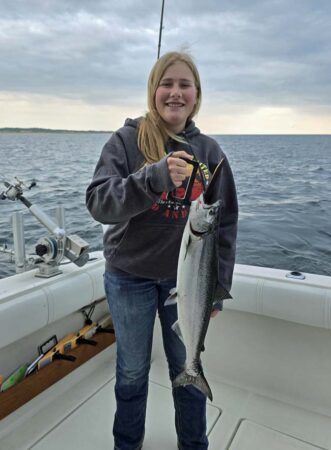 Our port low wire diver out 100 with a 8″ Kevin’s Girlfriend Spin Doctor/Blue Bubble Action Fly took a nice King. A 10 color core with an SS Metallic Frog took another King. We took a small Laker on an out down set at 55 with a pair of Green Glow spoons.