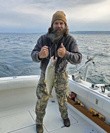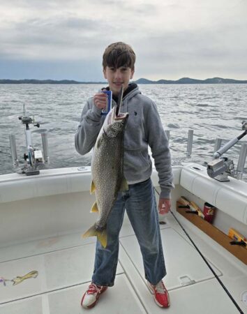 We missed one on a high wire diver ticking bottom with an 8″ Lake Trout Candy Spin Doctor/Chrome Blue Spin-N-Glo. We took one on it later in the morning.