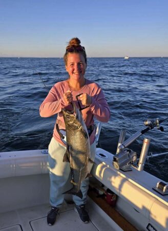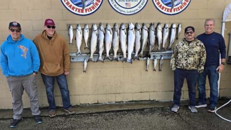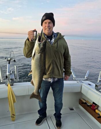 The early bite was good. All our bites were on our board rods. Our 1, 2, 3, 5, & 7.5 color cores all went with Dreamweaver Mini Captain’s Choice Plugs. We had a full size DW Salmon Slayer Plug on a 3 color that went twice until it broke off. Our best core was our port 3 color with a Mini Lucky Charms Plug. It went 4 times. Our other cores had Mini Pink Dot & Natural Glows on them. The action slowed inside so we pulled and ran out to deeper water. Again, it was mostly our board rods with spoons that took fish.