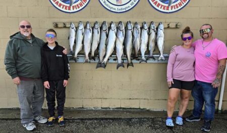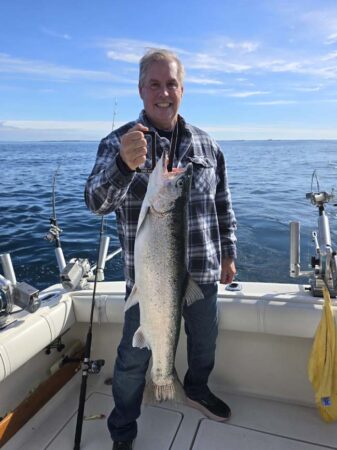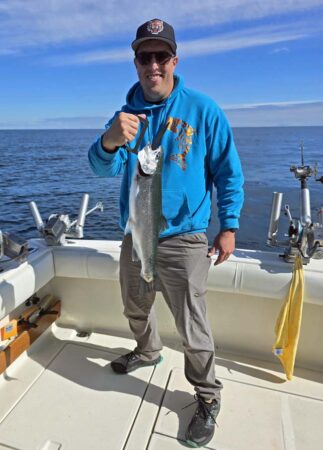 A 1 color with a SS Steelie Stomper went once. Port 2 color with a Double Orange Crush took a big Steelhead. It was 34 inches long and qualified for a Master Angler Award. Our 3’s & 5’s took fish with orange spoons. A 10 color went once with a Modified Coyote spoon. Starboard out down set at 45 with a pair of SS Chilly Willies took a Coho. Chute rigger down 110 with an 11″ White Slick Paddle/Pickled Sunshine Action Fly took a King. When we pulled lines, we found a couple small Coho dragging on our high lead cores.